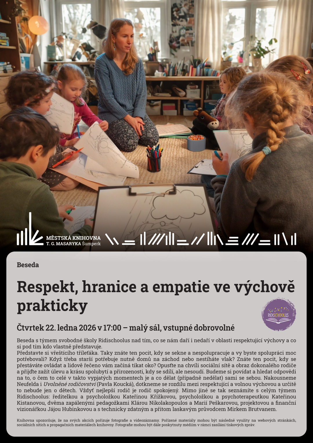 Představte si vřeštícího tříleťáka. Taky znáte ten pocit, kdy se sekne a nespolupracuje a vy byste spolupráci moc potřebovali? Když třeba starší potřebuje nutně domů na záchod nebo nestíháte vlak? Znáte ten pocit, kdy se přestáváte ovládat a lidově řečeno vám začíná tikat oko? Opusťte na chvíli sociální sítě a obraz dokonalého rodiče a přijďte zažít úlevu a krásu spolubytí a přirozenosti, kdy se sdílí, ale nesoudí. Budeme si povídat a hledat odpovědi na to, o čem to celé v takto vypjatých momentech je a co dělat (případně nedělat) sami se sebou. Nakousneme Neufelda i Uvolněné rodičovství (Pavla Koucká), dotkneme se rozdílu mezi respektující a volnou výchovou a určitě to nebude jen o dětech. Vždyť nejlepší rodič je rodič spokojený. Mimo jiné se tak seznámíte s celým týmem Ridischoolus: ředitelkou a psycholožkou Kateřinou Křížkovou, psycholožkou a psychoterapeutkou Kateřinou Kistanovou, dvěma zapálenými pedagožkami Klárou Nikolakopoulos a Marií Peškarovou, projektovou a finanční vizionářkou Jájou Hubinkovou a s technicky zdatným a přitom laskavým průvodcem Mirkem Brutvanem.