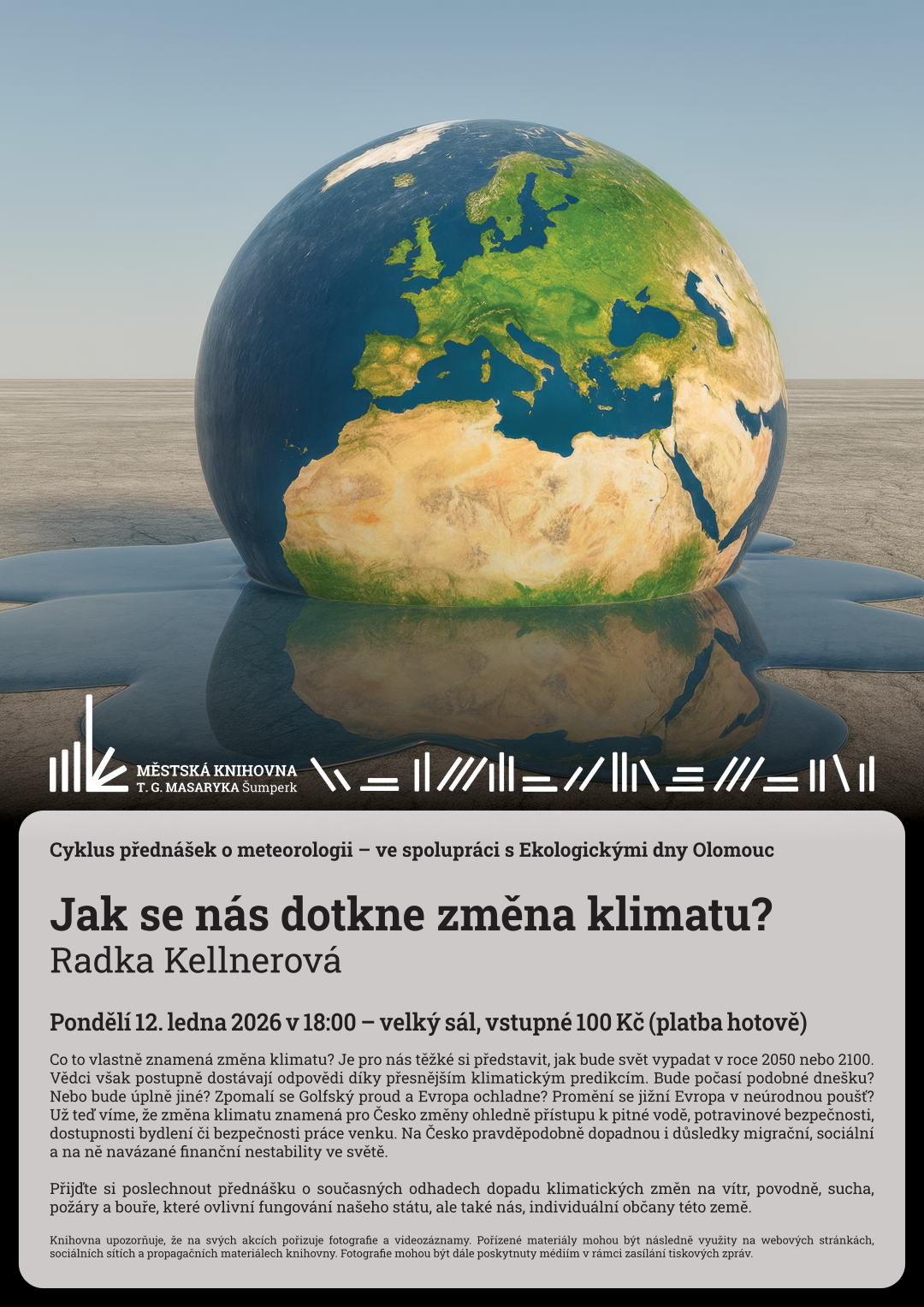 Přijďte si poslechnout přednášku o současných odhadech dopadu klimatických změn na vítr, povodně, sucha, požáry a bouře, které ovlivní fungování našeho státu, ale také nás, individuální občany této země.