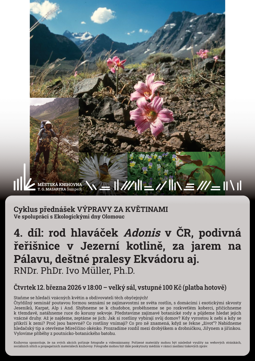 Čtyřdílný seminář poutavou formou seznámí se zajímavostmi ze světa rostlin, s domácími i exotickými skvosty Jeseníků, Karpat, Alp i And. Shýbneme se k chudobce, proběhneme se po rozkvetlém koberci, přičichneme k třemdavě, natáhneme ruce do koruny sekvoje. Představíme zajímavé botanické rody a půjdeme hledat jejich vzácné druhy. Až je najdeme, zeptáme se jich: Jak si rostliny vybírají svůj domov? Kdy vyrostou k nebi a kdy se přikrčí k zemi? Proč jsou barevné? Co rostliny vnímají? Co pro ně znamená, když se řekne „život“? Nabídneme hledačský tip a otevřeme Mireččino okénko. Prozradíme rozdíl mezi drobýškem a drobničkou, Jiřynem a jiřinkou. Vylovíme příběhy z poutnicko-botanického batohu.
