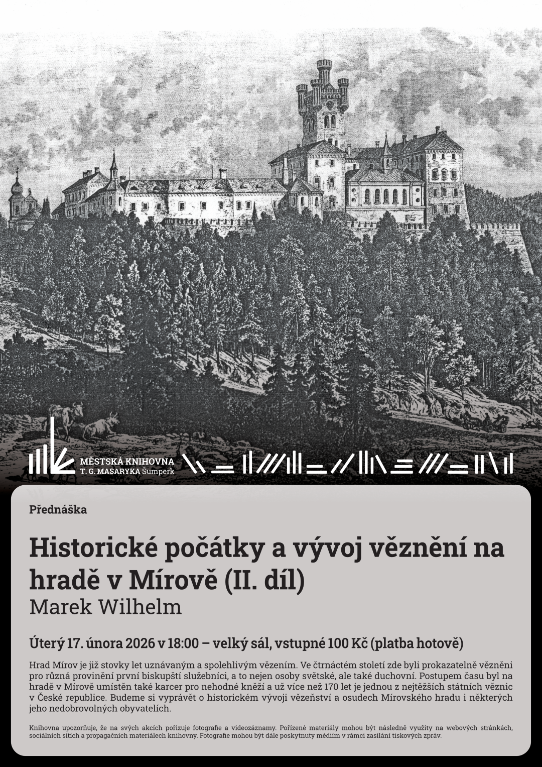Hrad Mírov je již stovky let uznávaným a spolehlivým vězením. Ve čtrnáctém století zde byli prokazatelně vězněni pro různá provinění první biskupští služebníci, a to nejen osoby světské, ale také duchovní. Postupem času byl na hradě v Mírově umístěn také karcer pro nehodné kněží a už více než 170 let je jednou z nejtěžších státních věznic v České republice. Budeme si vyprávět o historickém vývoji vězeňství a osudech Mírovského hradu i některých jeho nedobrovolných obyvatelích.