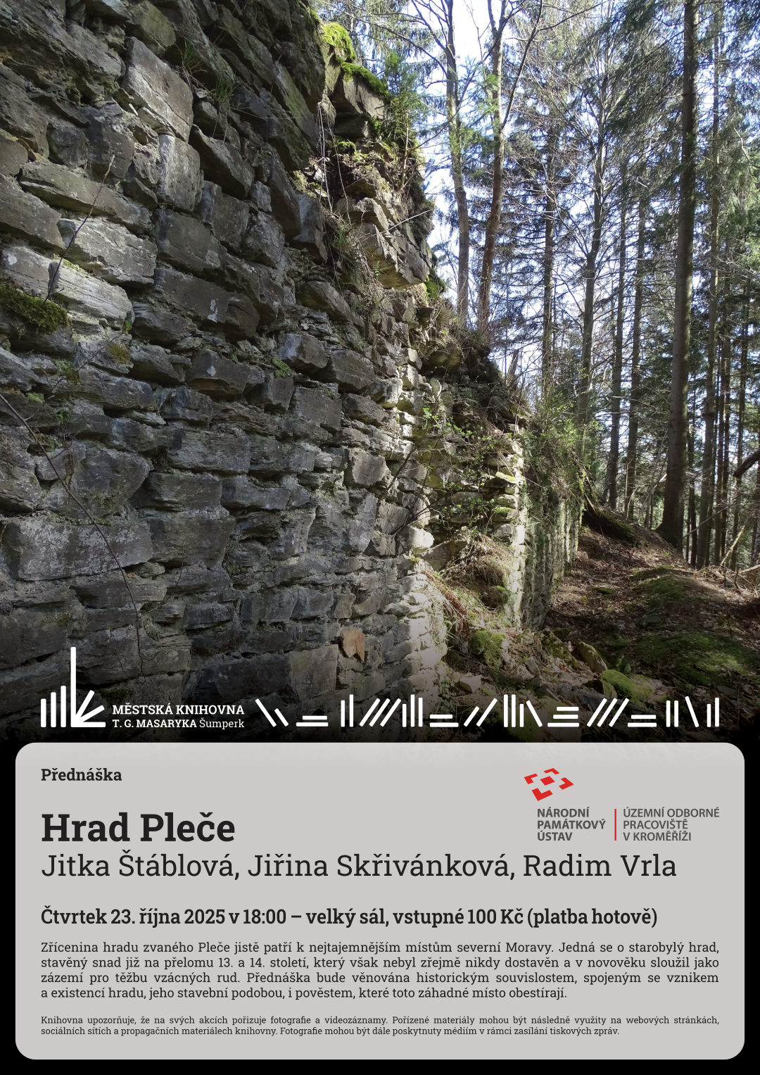 Zřícenina hradu zvaného Pleče jistě patří k nejtajemnějším místům severní Moravy. Jedná se o starobylý hrad, stavěný snad již na přelomu 13. a 14. století, který však nebyl zřejmě nikdy dostavěn a v novověku sloužil jako zázemí pro těžbu vzácných rud. Přednáška bude věnována historickým souvislostem, spojeným se vznikem a existencí hradu, jeho stavební podobou, i pověstem, které toto záhadné místo obestírají.