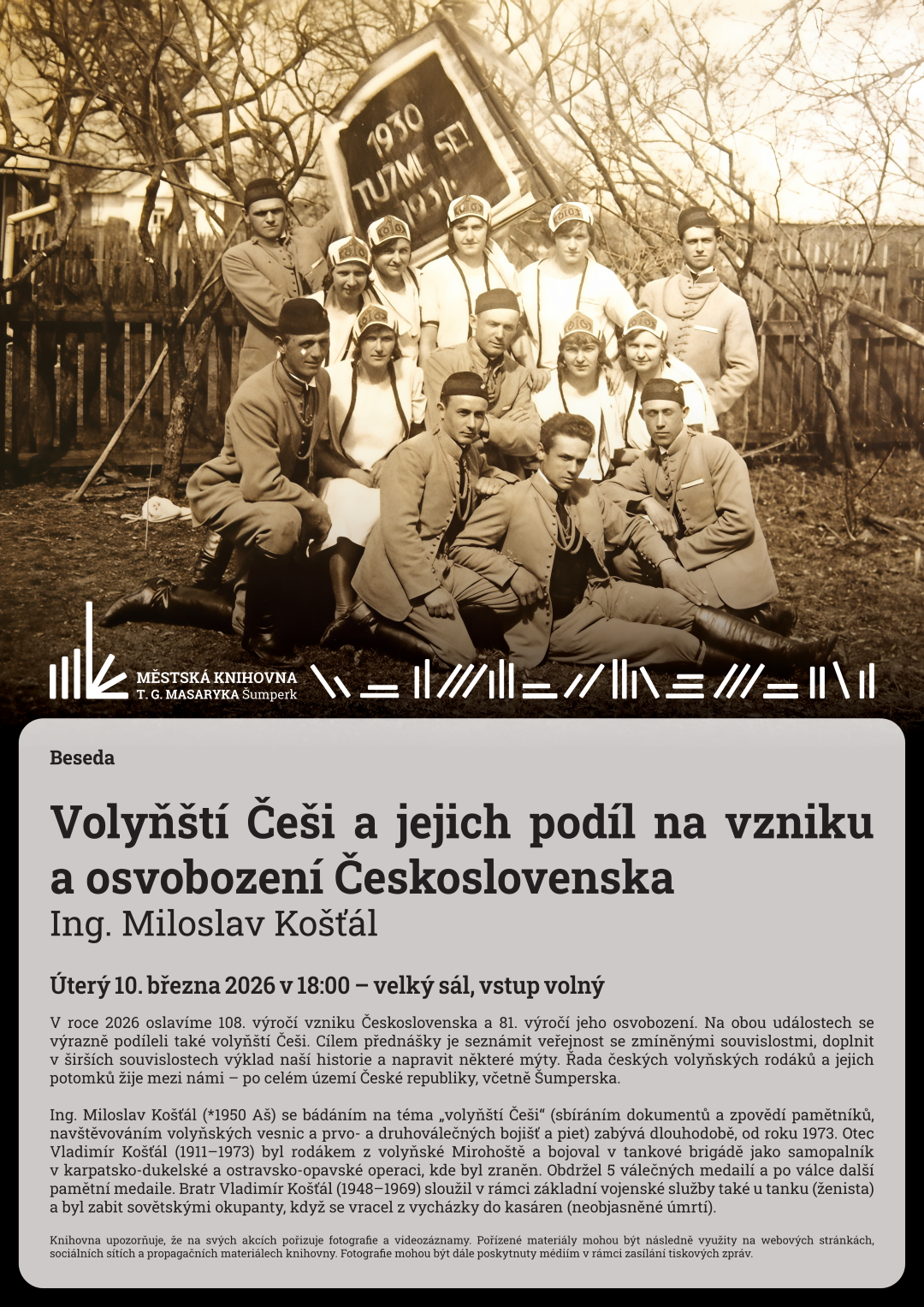 V roce 2026 oslavíme 108. výročí vzniku Československa a 81. výročí jeho osvobození. Na obou událostech se výrazně podíleli také volyňští Češi. Cílem přednášky je seznámit veřejnost se zmíněnými souvislostmi, doplnit v širších souvislostech výklad naší historie a napravit některé mýty. Řada českých volyňských rodáků a jejich potomků žije mezi námi – po celém území České republiky, včetně Šumperska.